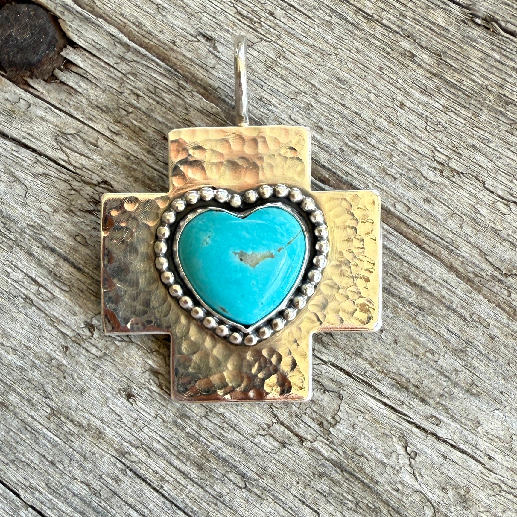 This Sterling silver Cross with Kingman Turquoise Heart Pendant is hand made in our studios along the historic Chisholm Trail. Styled in the fashion of a Greek cross this pendant is a magnificent representation of southwestern jewelry and has a beautiful Kingman turquoise heart cabochon set in the center. The pendant features a shepard hook bail design so it can be removed and added to any link or beaded style in your necklace wardrobe